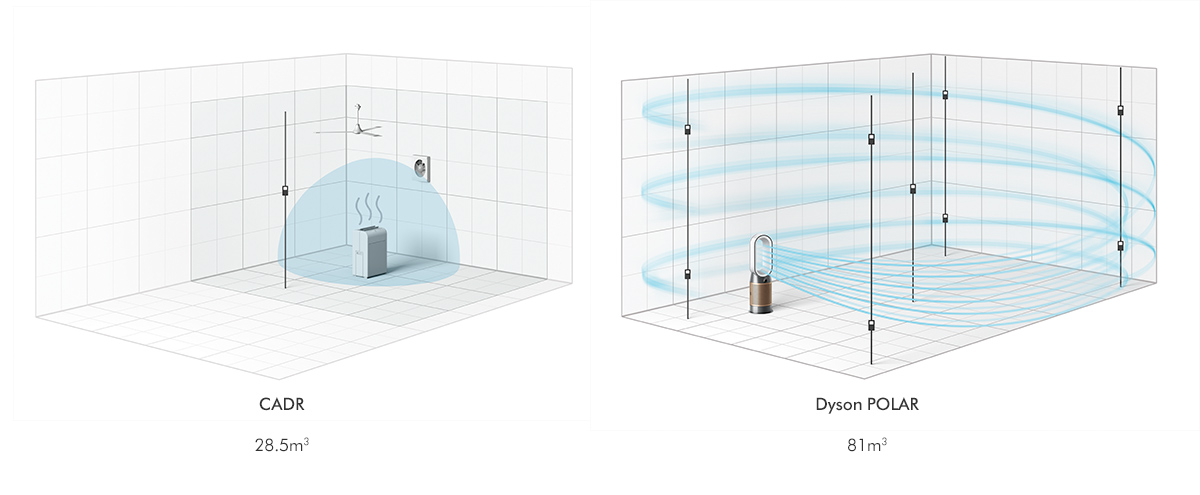 Tested beyond CADR, for real living spaces As you can see, Dyson purifier testing exceeds the industry-standard CADR test method – to better a reflect real home environment.